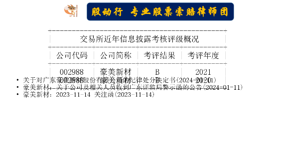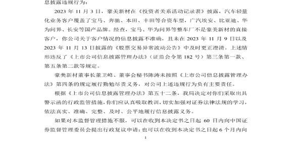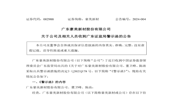 $豪美新材(SZ002988)$股价异动后再被警示,而且或将引发炒股维权,咋回事呢?,1月12日晚,发布了“豪美新材:关于公司及相关人员收到广东证监局警示函的公告”,因宝马、华为问界等并非公司直接客户,公司信披不准确被警示,且严重影响了投资者决策。