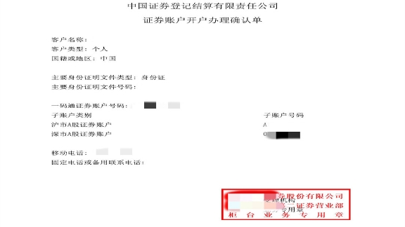 二、 开户确认书(或股东卡),一般由券商通过中登公司系统打印,为账户所属人的证明文件,务必要有姓名,身份证号,账户号等信息,并盖章,以此证明是账户本人参与上市公司维权。